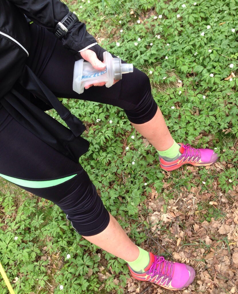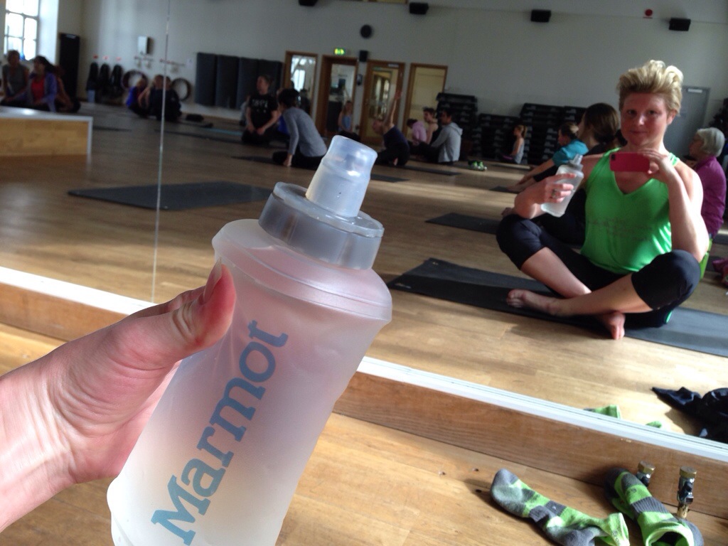 Den mjuka vattenflaskan från Marmot var perfekt vid yogging. Lätt att krama om och hålla vid löpningen och sen fylla inför yogaklassen. Övrig klädsel från Casall, Röhnisch, Gocooco och Merrell.