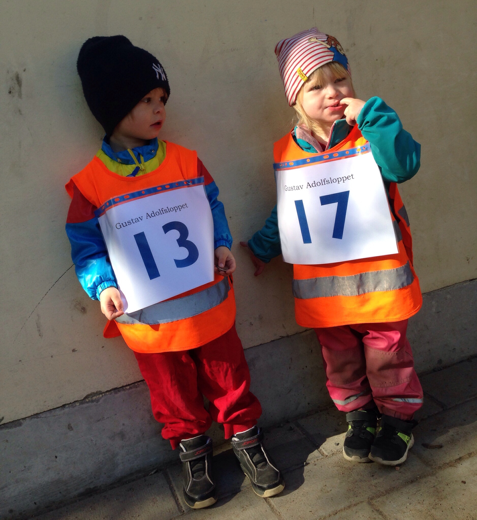 Jonna och Junior laddar upp inför förskoleloppet i fina västar med nummerlapp – Junior med mammas födelsedagsdatum och Jonna med pappas. Tur!