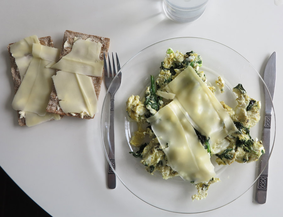 Precis lika snabbt som att koka gröt i micron var det att scrambla bladspenat och ägg. Upp på en tallrik och på med ett par skivor ost som får smälta till en krämig konsistens. Till det ett par knäckemackor med smör och ost. Ni som följer mig vet ju att jag älskar scrambled egg på hotell och den här blev dessutom pimpad med spenat. Finfin fredagsstart!