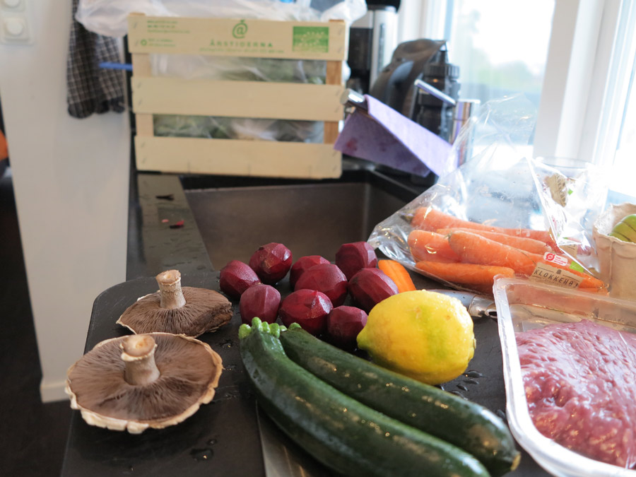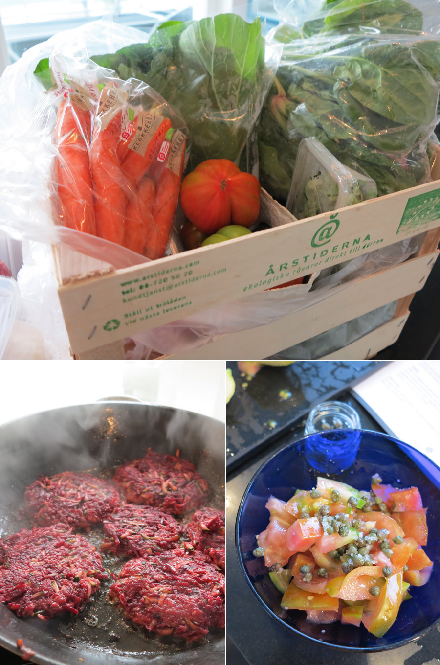 I måndags lagade jag parisare av ekologisk nötfärs, riven rödbeta och squash, stekt portabellasvamp och en tomatsalsa med ansjovis och kapris. Till detta en potatisgratäng som inte ingick i matkassen men som jag tyckte passade bra till.