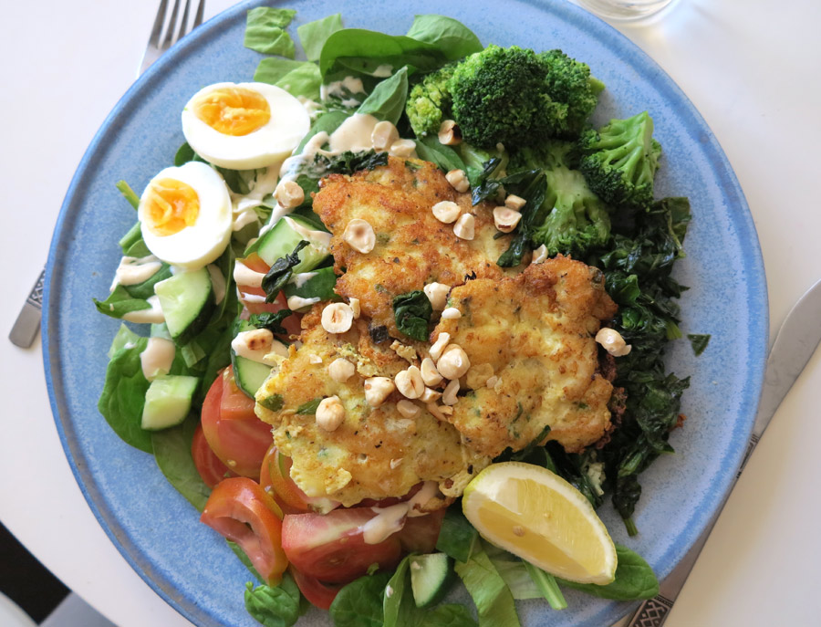 Gårdagens middag var fishcakes med smak av ingefära, citron och thaibasilika på en bädd av bladspenat och hastigt rostade hasselnötter. Jag gick inte helt efter receptet utan stekte spenaten med pressad vitlök och örtsalt istället för att äta den rå. Hade dessutom kvar en burk ponzu mayo (majonässås från en sushirätt) och kokt ägg till.