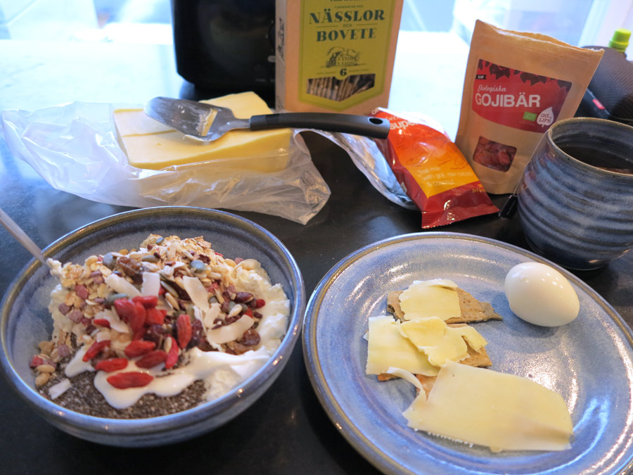 Jag har även fått hem en låda med blandade produkter från The Healthy Box som kostar 179 kr/månad. Den innehöll bl.a. tidningen Hälsa, en rawfoodbar, nässel- och boveteknäcke, gojibär och superfruit av olika märken. De tre sistnämnda testade jag till dagens frukost ihop med kesella, yoghurt, chiafrön, müsli, ägg och ost.