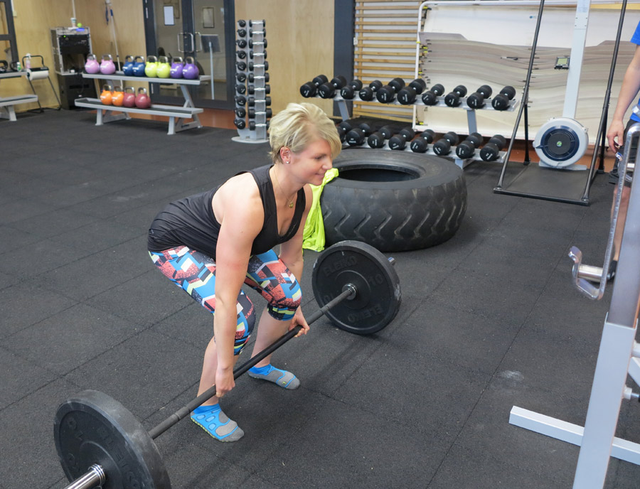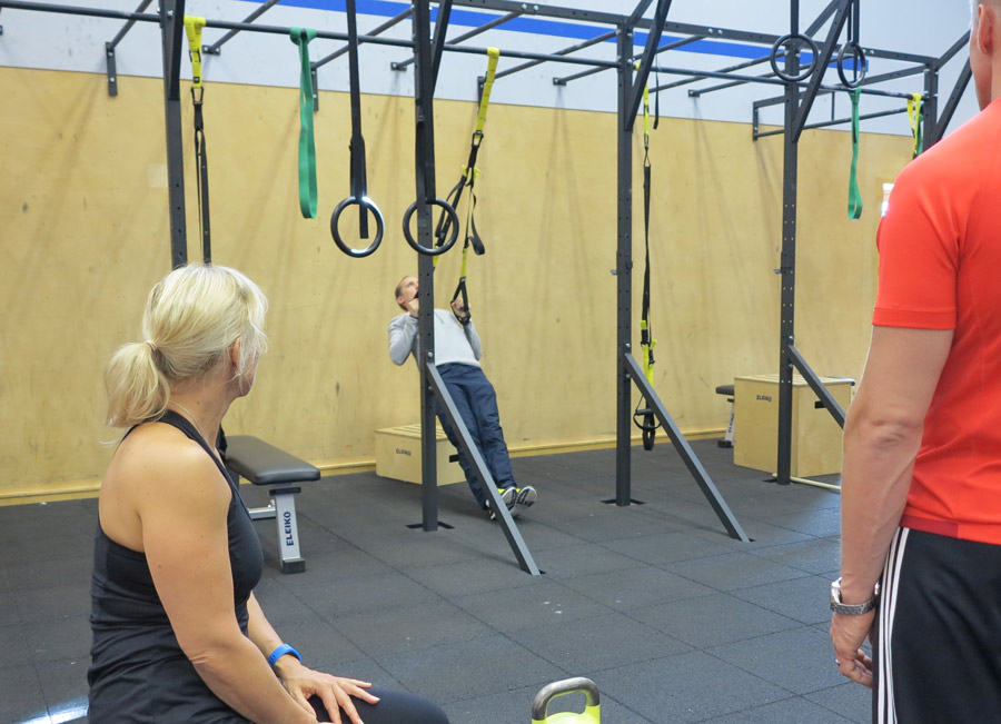 Nu har vi snart hunnit igenom alla rörelser och övningar med knäböjningar, höftfällningar, pressar, dragövningar, utfall, rotationer och bålstabilitet. För varje rörelse får vi lära oss hur dessa progressivt kan byggas upp för att öka kraven på styrka/balans/core eller vad syftet med träningen är. Ovan visar Caroline ett utfallssteg åt sidan – en svårare variant som därför ligger längre bak i progressionsskalan än ett utfallssteg bakåt. Kanske inte förstahandsalternativet till en nybörjare med andra ord, men Caroline klarar den galant.