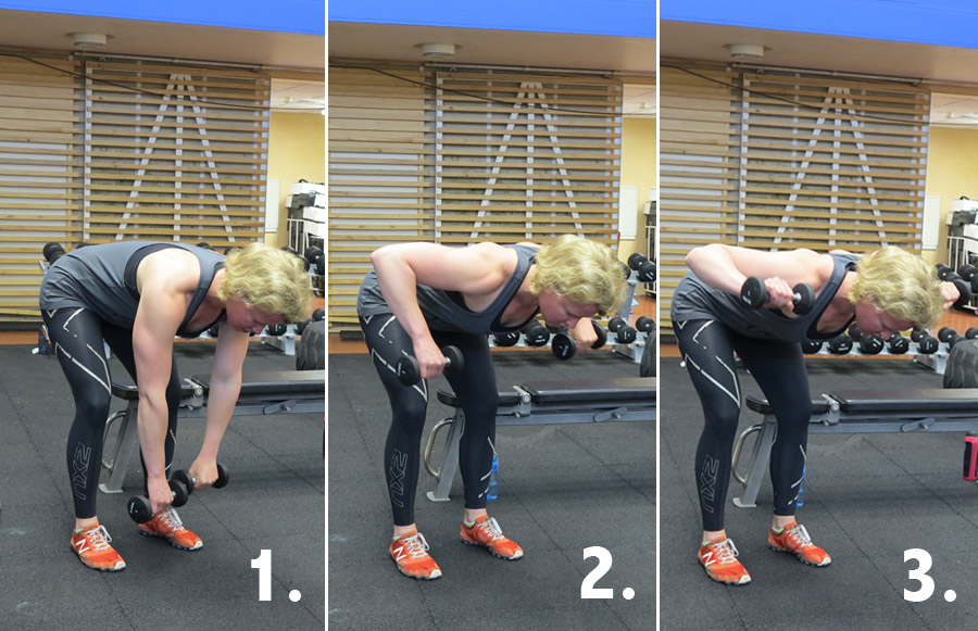 - Ställ dig i en framåtlutad position (45 grader) med hantlar i händerna och handflatorna vända in mot kroppen.