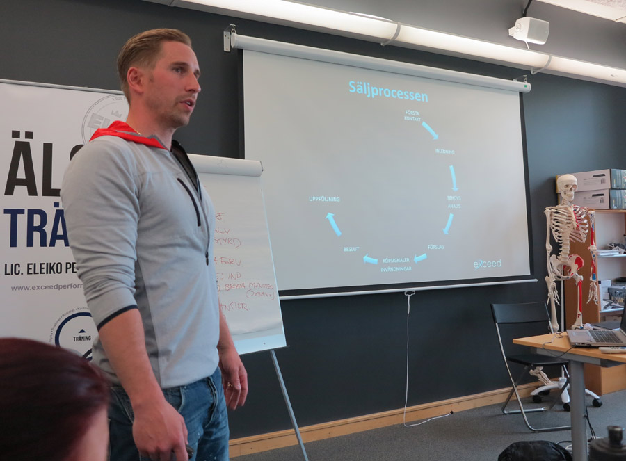 Försäljning var gårdagens tema och Dennis Brunholtz gav oss många bra verktyg och tankar. Sälj går mycket hand i hand med kommunikationen – att med väl valda ord få någon att inse vad personlig träning kan göra för deras livskvalité. För hur kul det än är att jobba med sin hobby måste du våga ta betalt, och hur stor kunskap du än har om träning så kommer inte kunderna ramla över dig. Vill du kunna försörja dig måste du även jobba som säljare. Hårt och målmedvetet jobb krävs och en bra plan underlättar. Helst ska du ordagrant skriva ner din handlingsplan och följa denna för att på bästa och snabbaste sätt nå ditt mål – precis som för att nå dina träningsmål.
