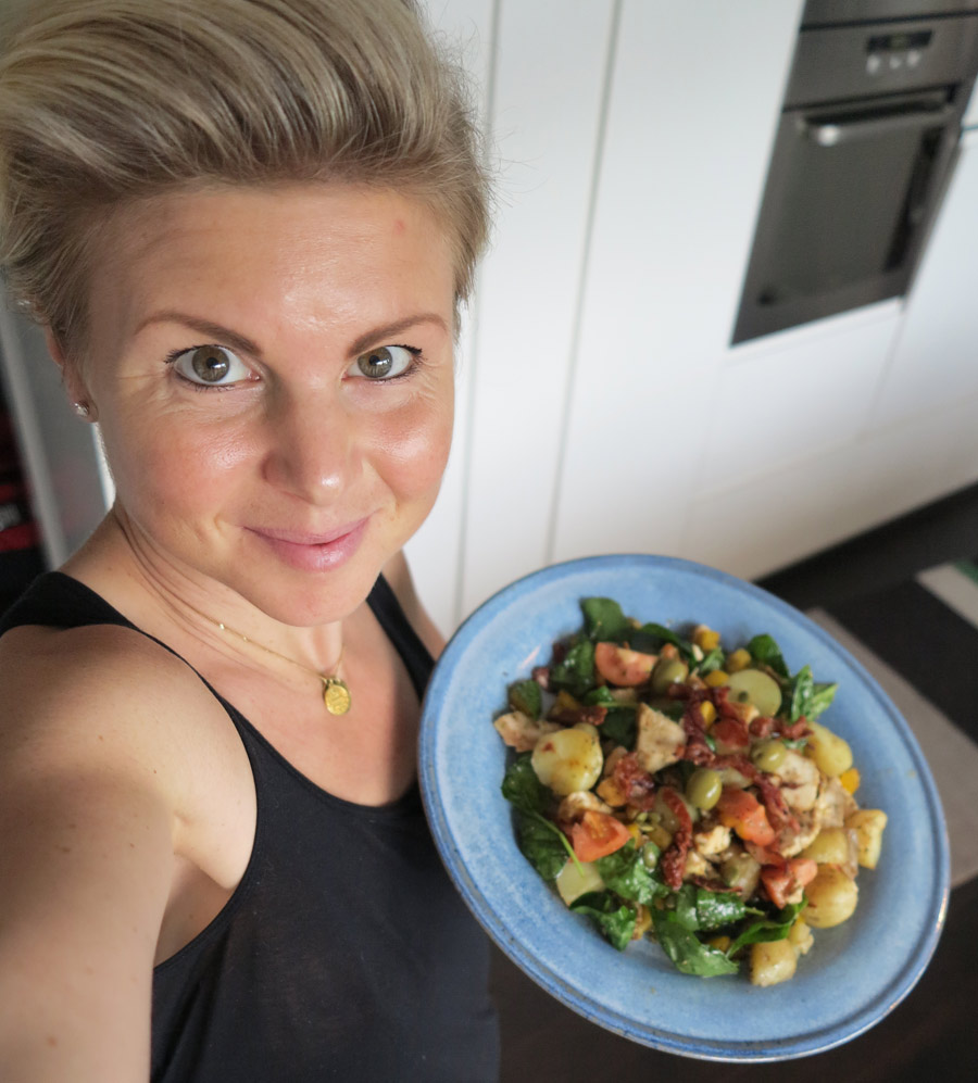 Det mest optimala tillbehöret vore kanske sill? Det var jag inte sugen på, men några färdiggrillade kycklingfiléer låg i kylen som gav mig idén om potatissallad. Ljummen sådan av nykokt färskpotatis enligt konstens alla regler, bladspenat, vinegrette av olivolja, balsamvinäger, örtsalt, dill och peppar, paprika, färsk och soltorkade tomater, pumpakärnor, oliver, kyckling och knaperstekt bacon.