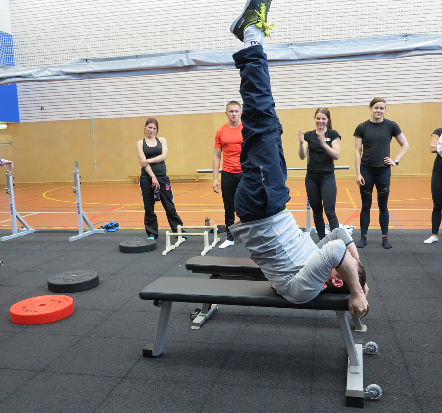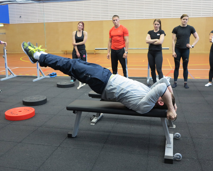 Att tänka på: För att arbeta utsträckt kan man tänka att rumpan inte ska nudda bänken innan fötterna är helt nere. Är övningen för tung – prova att böja ett ben eller kom ner med ryggen på bänken och jobba bara med raka ben upp och ner.