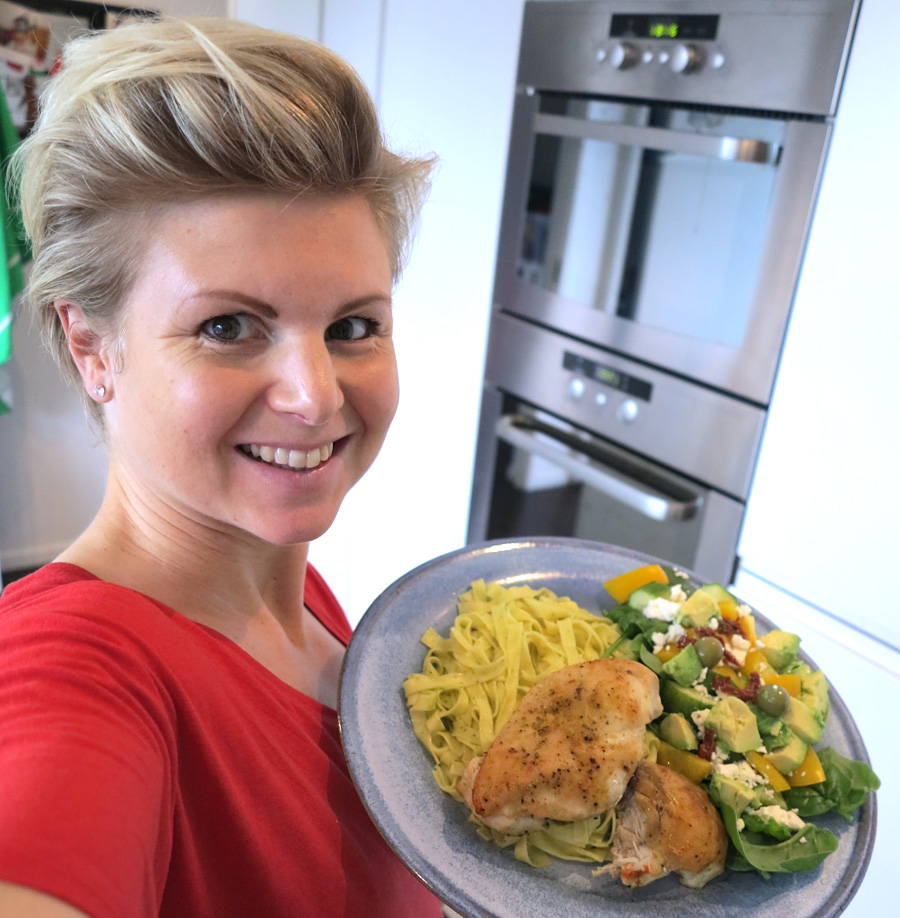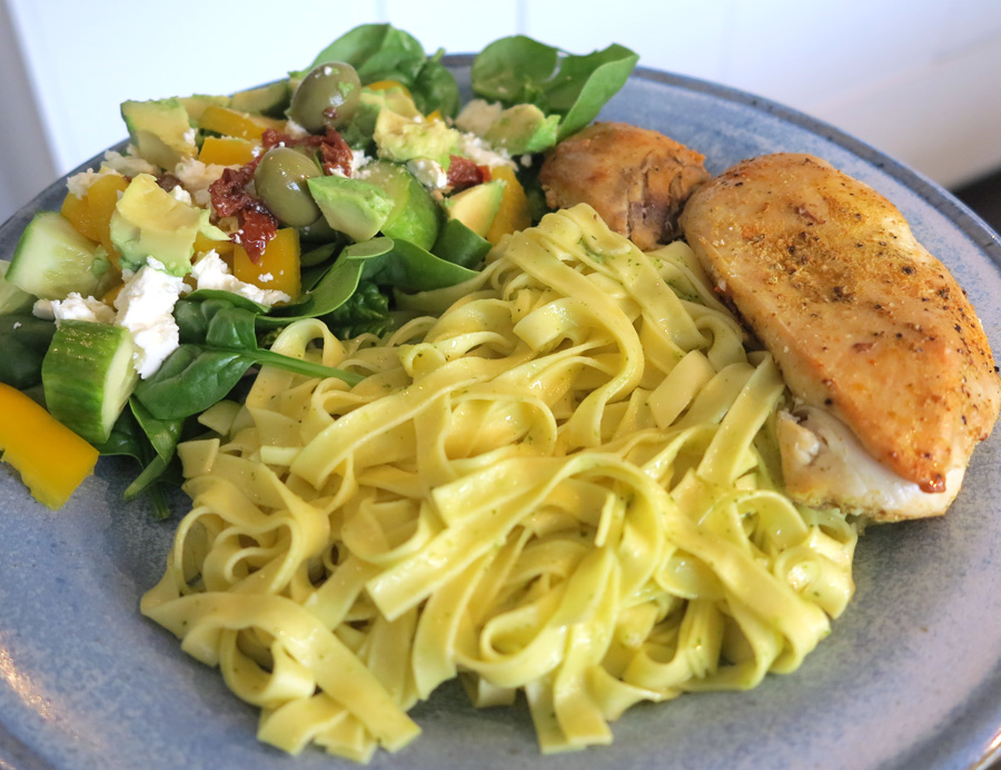 Gårdagens middag: Pasta med pesto, kyckling och sallad med avocado, soltorkade tomater, fetaost och oliver.