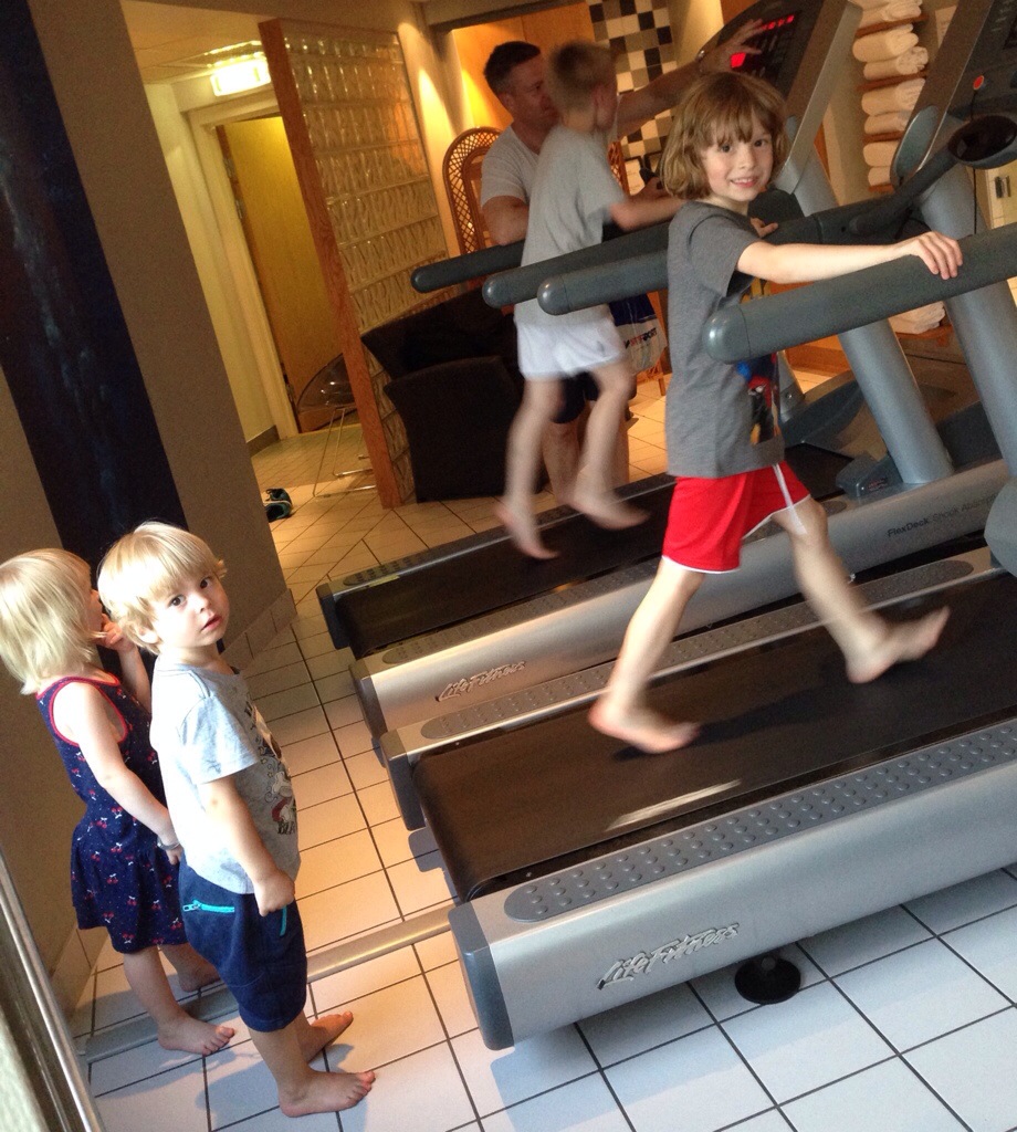 Hemma i stan finns det lite träningsutrustning i föreningens källarlokal dig Hugo, Hampus och grannpojken brukar leka att de går och tränar. Igår ville de testa hotellets löpband och det var inga problem att hoppa av i farten för att ståvila som jag gör vid mina snabba intervaller. Jag längtar tills jag får en löpkompis i familjen, och var själv bara 7 år när jag började springa korta rundor som fysträning inför längdskidsäsongen. Så om de vill får vi ta en runda snart.