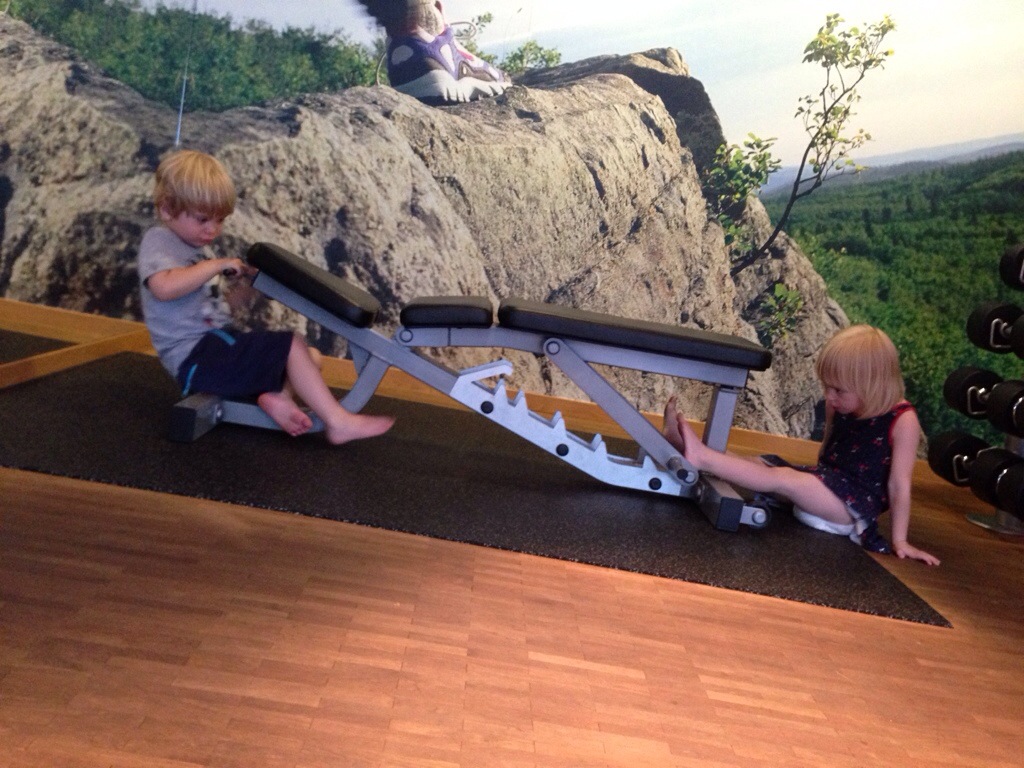 Jonna och Junior gillar också att träna. Bänken blev perfekt som bil.