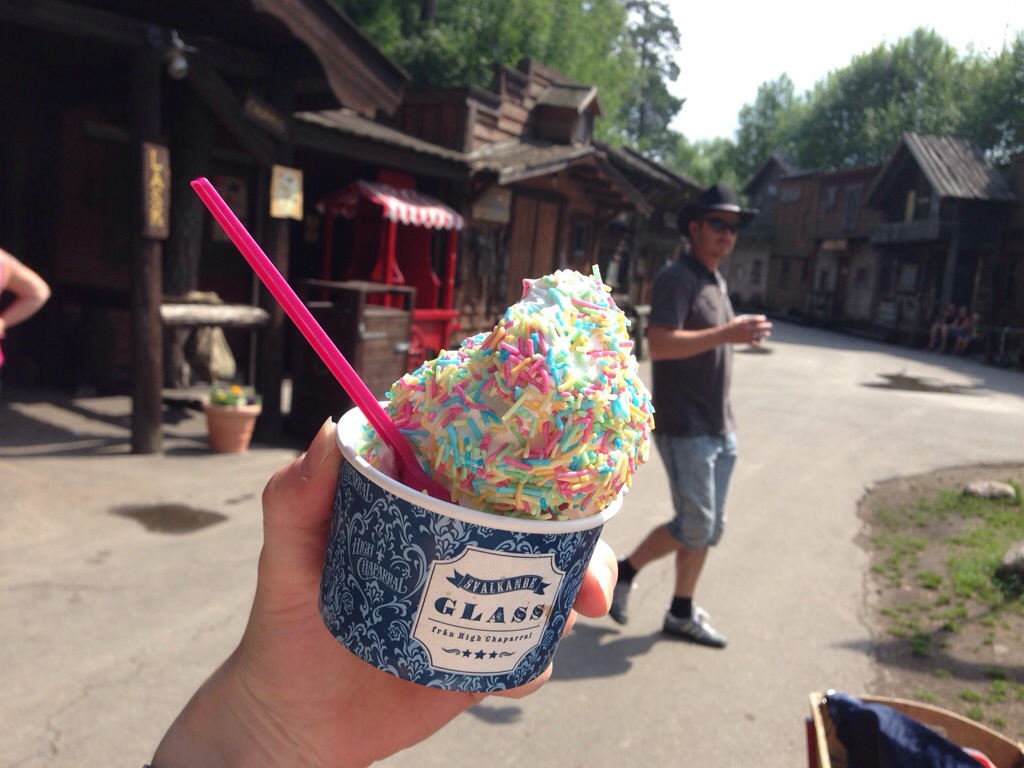 …och glass! Det blev varmt att gå runt i solen, så ett par timmar räckte innan vi packade in oss i bilen igen och åkte sista biten ner till Skåne. Här har vi fått låna en hästgård i Kivik av vänner och det är så vackert. Vi har precis installera oss och med hästar, gräsmattor för fotbollsspel, liten pool och stor grill kommer vi trivas jättebra. Löpskorna är med, en TRX likaså, och Jonas har googlat på gym. Ja, träning hör semestern till mellan glassandet. I två +30-års ögon 🙂