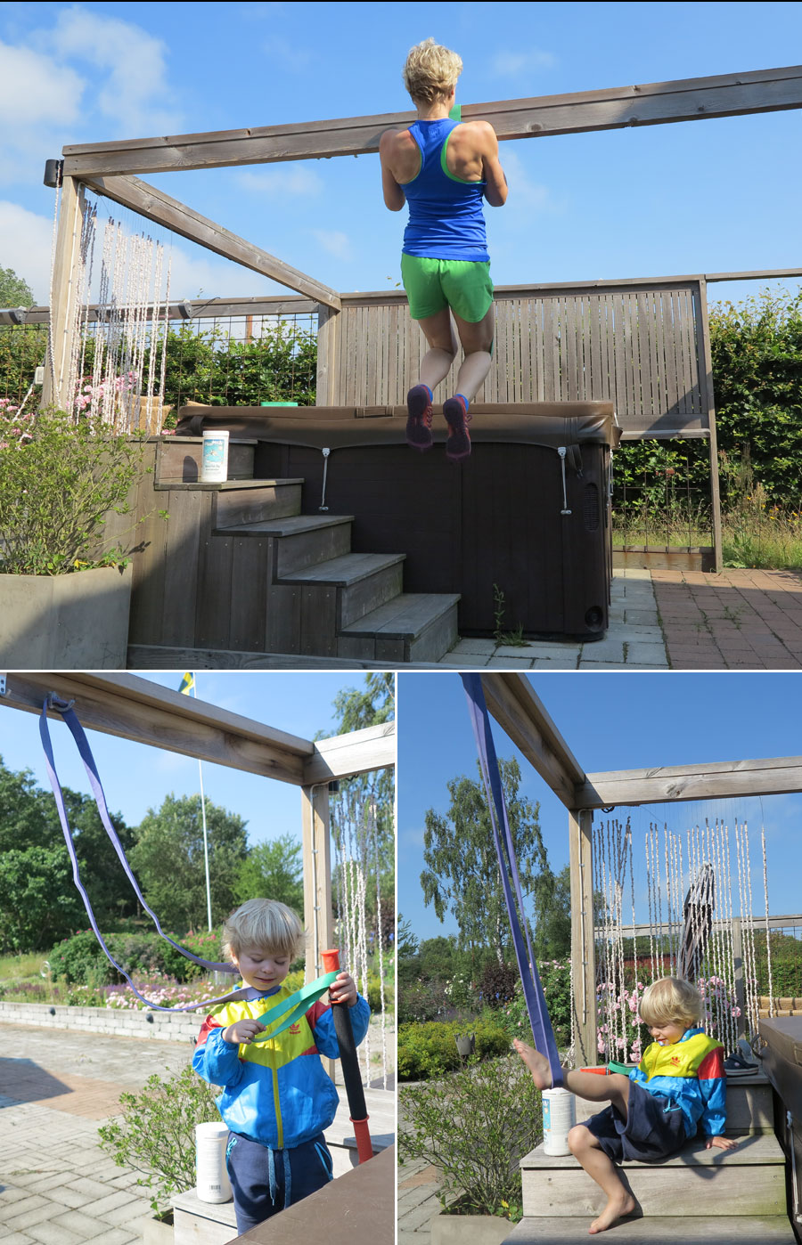 ..och chins med assistans av gummiband och en nyvaken Junior. Han hittade på egna övningar med gummibandet – en livsfarlig halsvariant och en för assisterade dips. Smart!