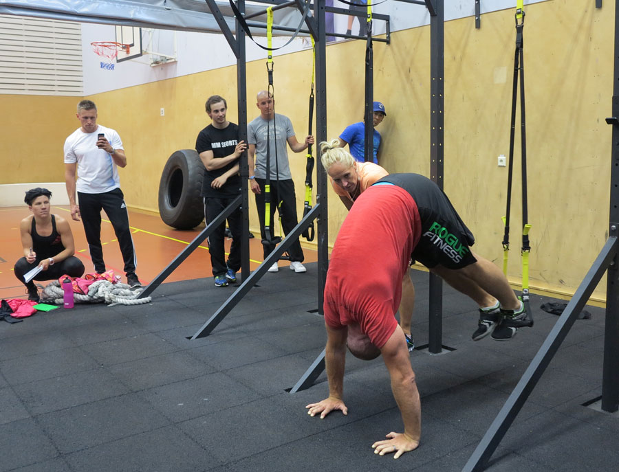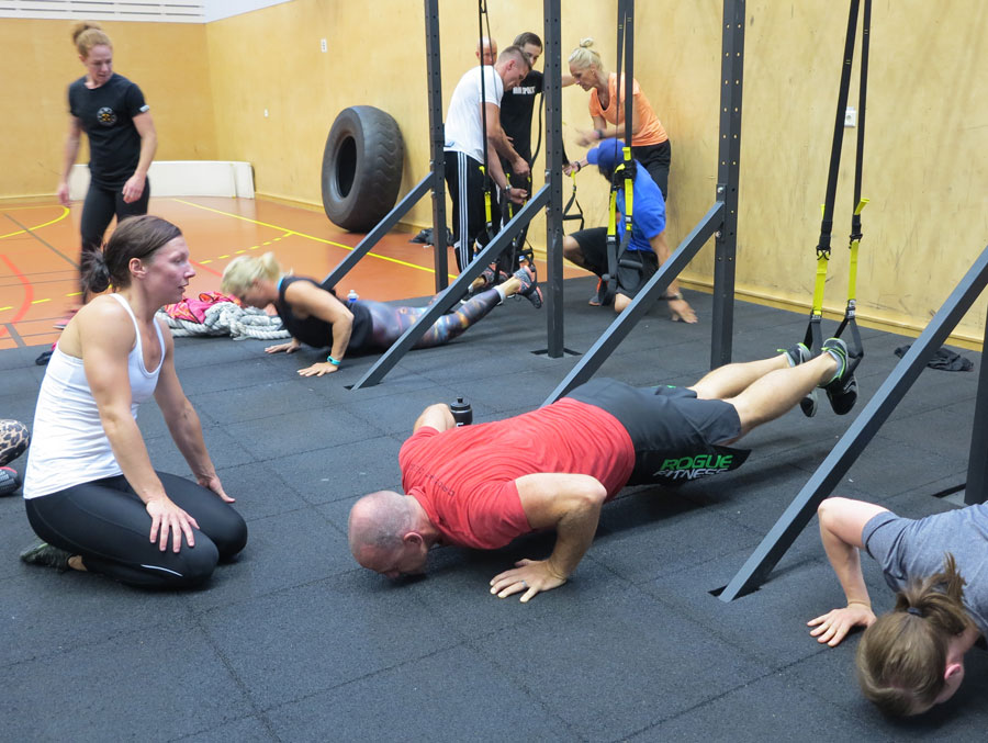 Här kan du välja hur tung du vill ha armhävningen. Genom att backa bakåt med händerna så att benen kommer högre upp får du en tyngre variant med mer belastning på axlarna.