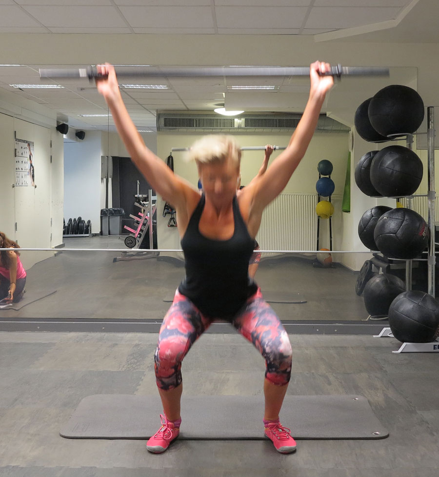 En av alla bra övningar vi fick lära oss på Lic. Eleiko PT-utbildningen var denna kombinerade knäböj + axelpress. Samtidigt som du går ner i en djup knäböj pressar du stången upp mot taket och sträcker sedan på benen upp till stående igen. Kan låta simpelt men här sätts verkligen rörligheten i bröstryggen på prov. Själv är jag så stel att jag inte klarar övningen med vikt på stången, men ett tips som underlättar är att ha viktskivor under hälarna och bredda avståndet mellan fötter och händer. Eftersträva alltid fullt rörelseomfång, d.v.s. böj så djupt du kan med raka armar.