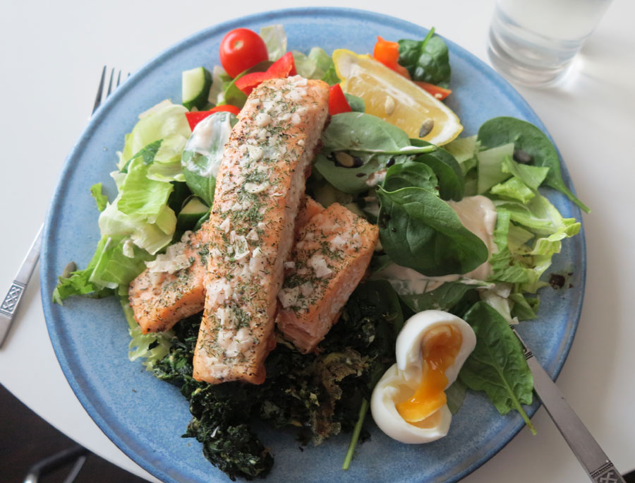 Gårdagens middag – grillad lax, sallad, stekt bladpenat, ägg, överbliven ponzu mayo-sås.
