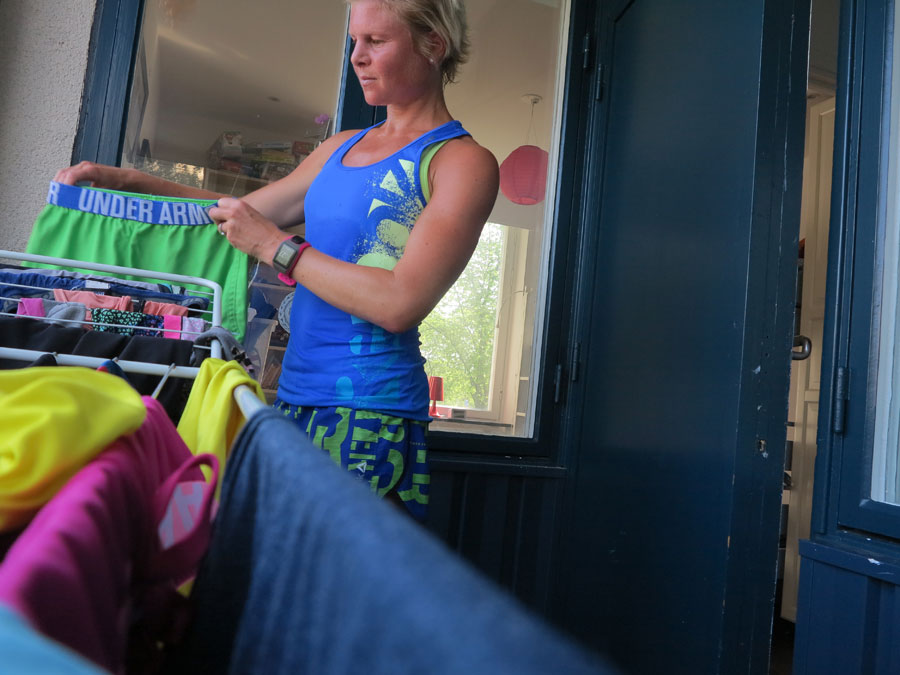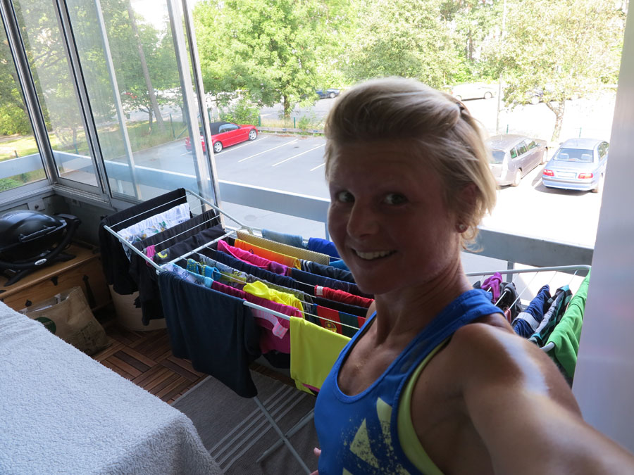 En plats för eftersvett och hänga tvätt. Som efter morgonens runda innan Jonas åkte på jobb. När syftet är kort distans och fart tycker jag det är bra med lite tidspress. Precis som en PT – att något annat puschar dig. Men det är inte klokt vad svetten rinner långt efter passet och då är balkongen bästa platsen att svalka sig.