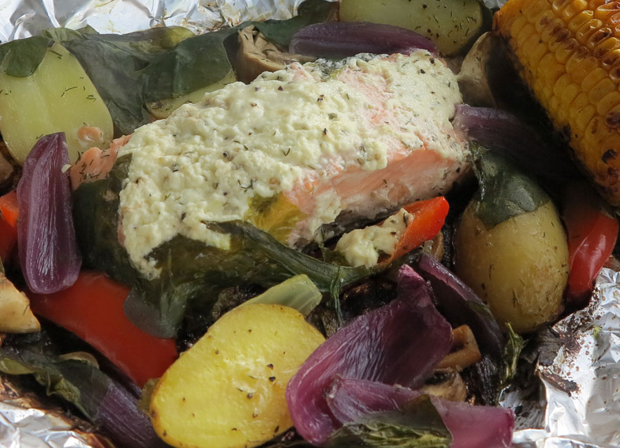 ..middagens allt-i-ett-rätt. Lax med salt, peppar och en klick färskost med vitlök, potatis, bladspenat, champinjoner, paprika, rödlök och sist ut örtsalt och ringlad olivolja över hela härligheten + majskolvar vid sidan om paketet.