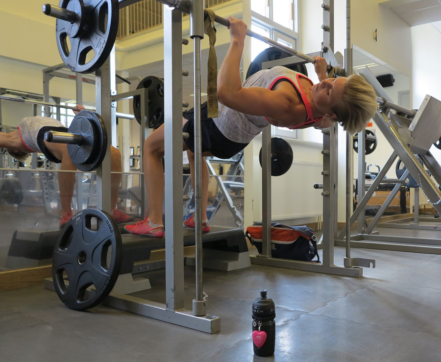 …styrka för överkroppen – mestadels i smithmaskinen enligt denna filmsnutt. Fyra set av varje övning i klippet + smala tricepsarmhävningar och stående baksida axlar i cabelcross i 3 superset.