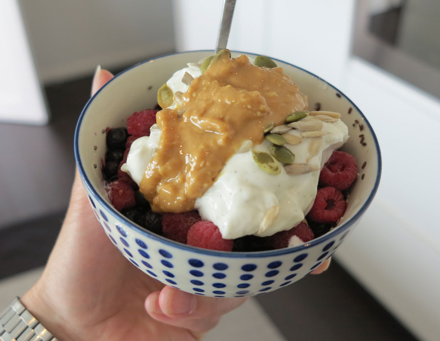 Chiapudding med vaniljkesella, bär, frön och jordnötsmör.