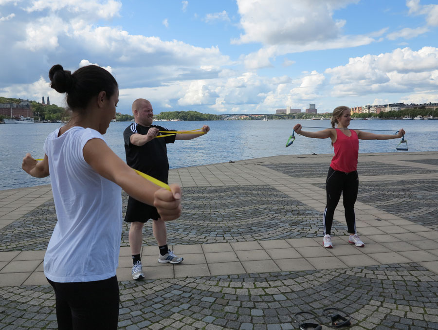 Monday is run in the sun day! Vi har haft ett väldans flyt med vädret just på måndagarna då jag leder två utomhusgrupper på Riddarholmen. Bild- och film är från förra veckan och även idag strålar solen inbjudande. Med båda gängen kör jag några styrkeövningar speciellt utvalda med tanke på passens tema och deltagarnas arbeten. Både löpare och skrivbordsarbetare kan behöva stärka musklerna mellan skulderbladen + axlarnas baksida och rotatorer för en bättre hållning. Den öppnar upp lungorna för mer syre, förebygger besvär i rygg/axlar och ger ett starkt och positivt intryck. För det är denna enkla övning bra: