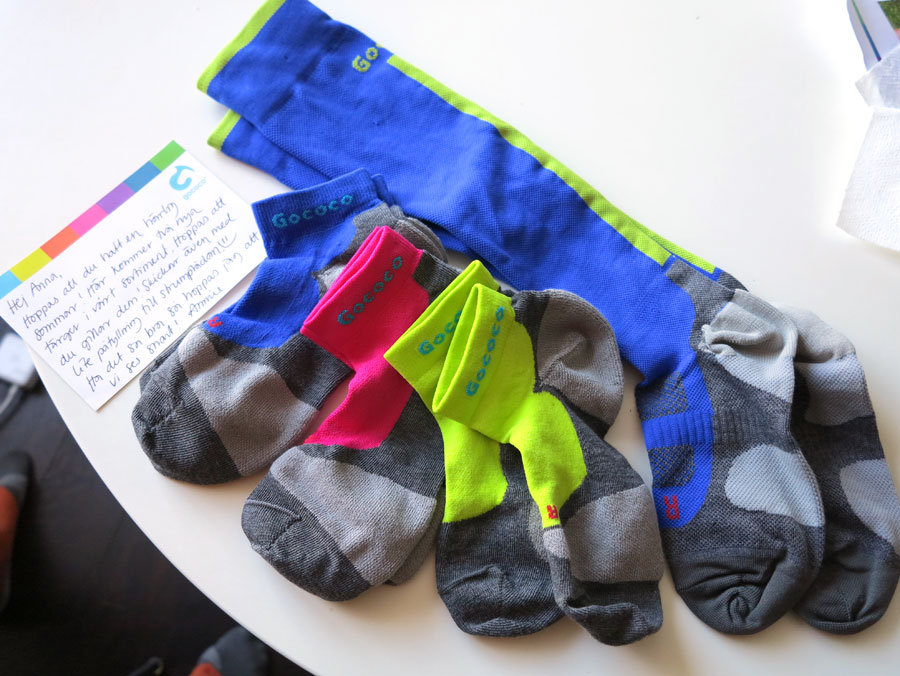 Det var inte bara släkt och vänner som överraskade med presenter och godsaker på min födelsedag. Hemma bland posten väntade ett paket från mitt absoluta favoritmärke bland av sportstrumpor – Gococo. Dels är de fantastiskt snygga i sina glada färger som går att matcha till olika outfits, dels sitter de som en smäck på foten och dels torkar de 5 gånger snabbare än andra polyesterstrumpor p.g.a. materialet 37.5 Technology. Torra strumpor = minskad friktion = mindre risk för skav och blåsor, något jag aldrig fått i strumporna.