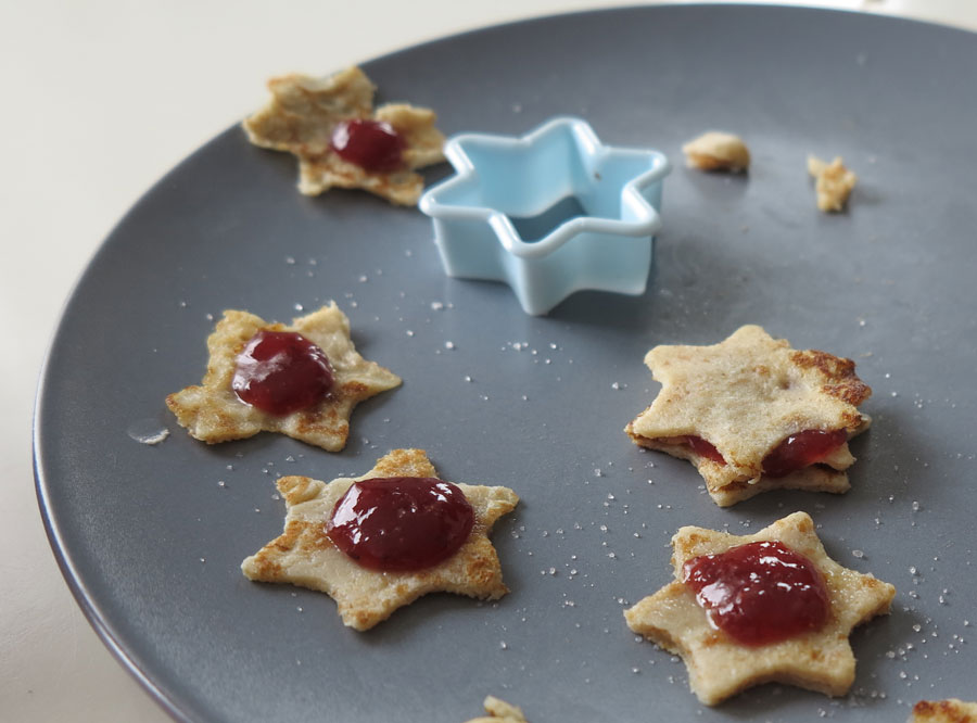 3. Att äta med ögat! Tänk FÄRG när du lagar mat. Vacker mat är ofta god mat och ”glad” frukt och grönsaker innehåller extra mycket nyttigheter. Dessutom lockas barn av rolig mat. Tryck ut frukt, grönsaker, bröd etc. med pepparkaksformer, gör grönsaksspett som de själva får sätta samman, eller pannkaksbakelser som ovan. Nu är socker och sylt inte det mest hälsosamma, men förbud är inte heller bra. Ser du till att fylla magen med en bra grund av ”byggmaterial” är det helt ok att toppa med det du är sugen på, oavsett innehåll vid vissa tillfällen. 80% bra val – 20%  ”fusk” kan vara en riktlinje där allt är tillåtet men inte alltid.