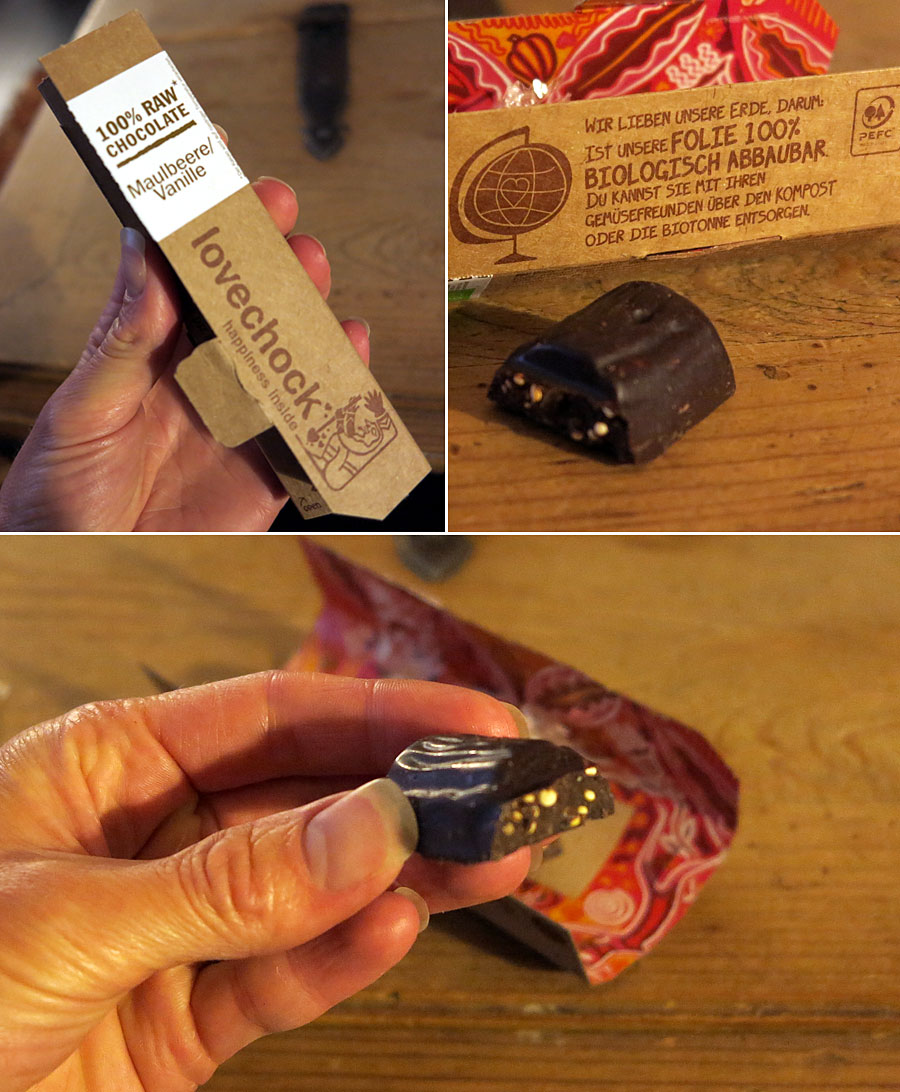 Dagar då jag INTE äter choklad i någon variant är ytterst få. Kakaonibs på gröten, i glass, i form av proteinpulver (favoriten är Whey 80 Double Rich Chocolate – just nu till 19% rabatt hos min samarbetspartner Bodystore), chokladbollar och ofta blir det en eller ett par godisbitar för att stilla efter-middags-suget. Under veckan har jag testat en extra fin ekologisk RAW-choklad av märket Lovechock. Chokladdoppade mandlarna (översta bilden) var ok men lite för bittra för min smak, men godbiten ovan med mulberry/vanilla. Choklad med söta bitar av mullbär inuti – mmmmmm! Fast utan gul förpackning och med extra gott samvete.