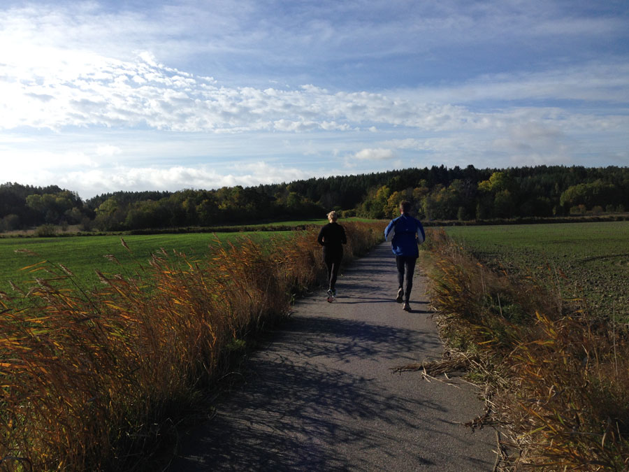 …ut på en härlig löptur. Det finns inget bättre sätt att se sig om på nya platser än i ett par löpskor. Här kunde vi verkligen njuta av sol, vackra fält, frisk luft och spännande byggnader. Dessutom stärkte vi våra kroppar med löpskolningsövningar, pulshöjande 10 x 15-sekundersintervaller (5 sek vila mellan varje) och..