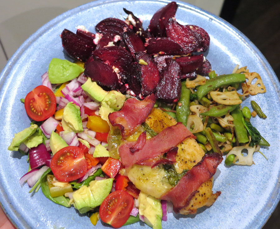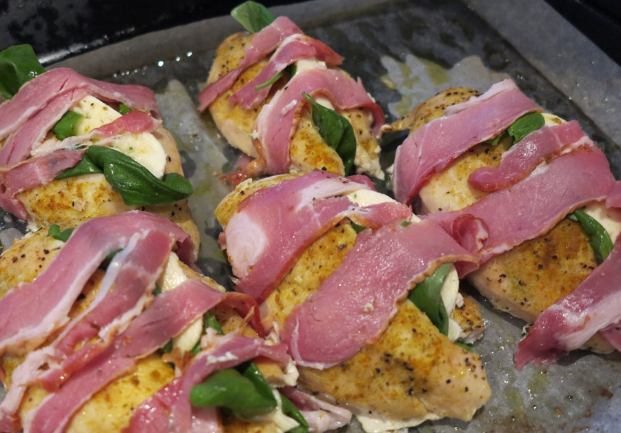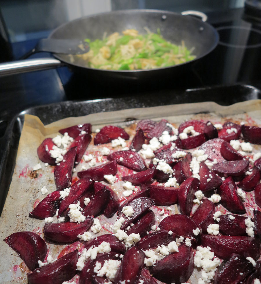 Till söndagsmiddag gjorde jag kycklingfiléer med mozarella och basilika, inlindade i bacon. En bortglömd favorit hemma hos oss. Till dessa fräste jag en påse Wok-grönsaker i kokosolja (ger jättegod smak till grönsakerna) och ugnsstekte klyftor av rödbeta i ugnen. Som pricken över i gratinerade jag slutligen de vinröda betorna med fetaost.