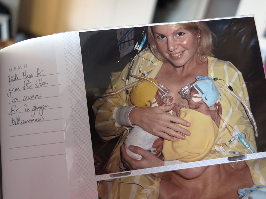 Besöket på SÖS väckte även andra känslor till liv. Det var där Hugo och trillingsystern Jonna bodde sista tiden innan de fick komma hem. Och jag. Varje morgon gick jag dit för att sitta med de små fågelungarna, hud mot hud på bröstet innanför sjukhusskjortan.