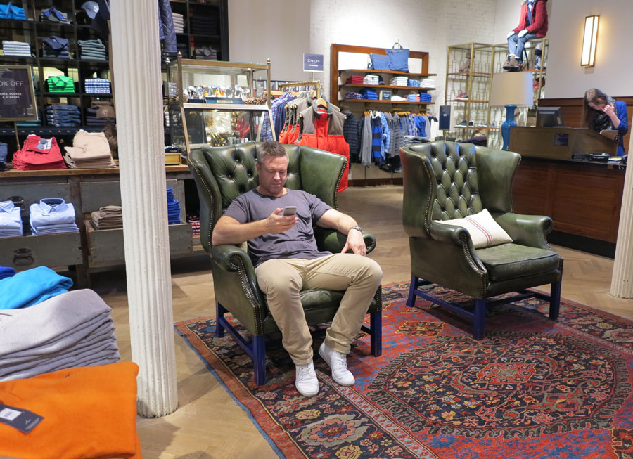 Det tar dock på krafterna att vandra runt och prova plagg. Eller titta på när andra gör det. Jonas är lika taggad som jag på att shoppa, men jag har bättre uthållighet. Vi har säkert gått minst 2 mil om dagen, exkl. vår träningsrunda, så det är klart benen blir trötta. Då är fri Wi-Fi i flera butiker bra tidsfördriv.
