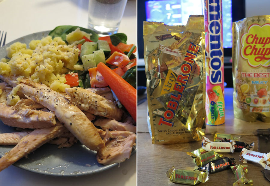 Energi från sömn, men även den fina middagen vi välkomnades med av mina föräldrar. Röding, mandelpotatis och morötter från Jorm + lite smarr från taxfreen framför nystartade ”Så Mycket Bättre” (älskar att barndomsidolen Orup är med) senare på kvällen.