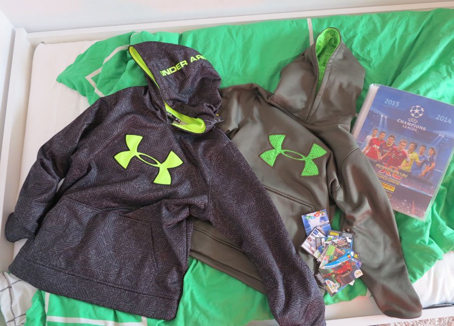 Men lite hade barnen ändå längtat mig och Jonas. Och efter presenterna. Junior blev mest glad över en Spiderman-klocka i plast, Jonna över ett flygplan från Planes-filmen, Hugo och Hampus över fotbollskort som Jonas köpt här hemma. Det var det enda de önskade sig – som inte fanns i USA (bara baseboll eller hockeybilder), men alla fyra fick nya jackor från The North Face i olika färger (vändbara med ena sidan mönstrad), och de stora fick Under Armour-tröjor och Adidas-sneakers. Allt till ca halva priset mot här hemma.