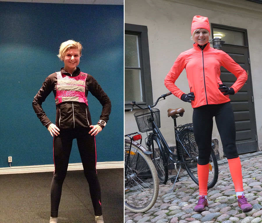 Löpkläder vänster: Jacka och tights – Casall, reflexväst – Röhnisch, strumpor – Icebreaker, skor – Merrell Allout Fuse. Löpkläder höger: Jacka, tights, mössa, handskar – Craft, strumpor – Ullmax, skor – Merrell Allout Fuse, klocka – TomTom.