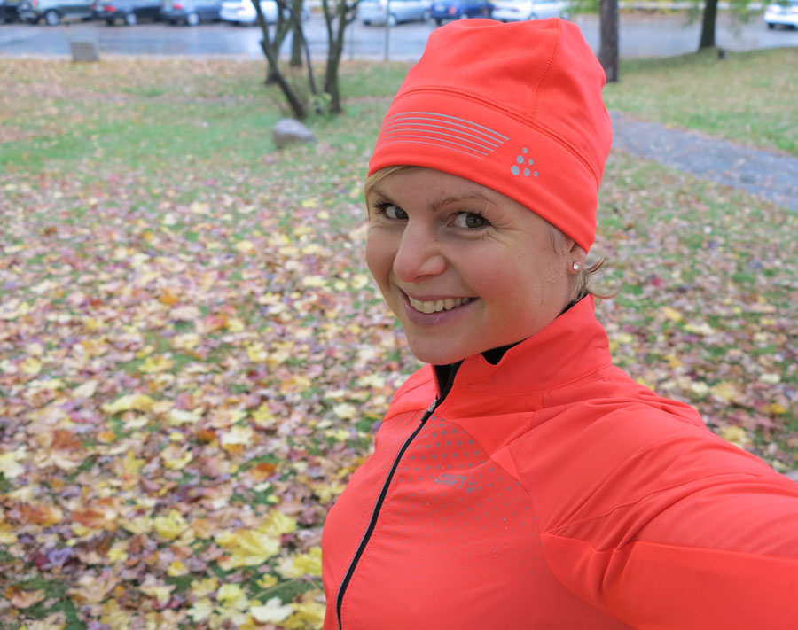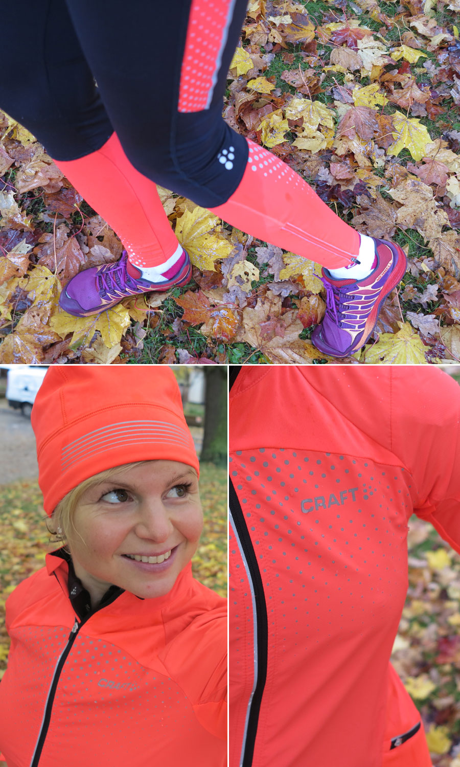 ..lyste min nya löputstyrsel ur Craft´s PR Brilliant Thermal-serie upp den grå dagen. Höstlöven låg i lä gällande synlighet och jag behövde verkligen inte frysa när jag coachade mina två företagsgrupper (mest från sidan varför varm klädsel behövs). Både tights och mössa är fodrade och jackan vind- och vattenavvisande. Sistnämnda behövdes verkligen vid min andra företagsgrupp då det började ösa ner, och andra funktioner jag gillar med jackan är fickor som rymmer iPhone, nycklar etc, det elastiska materialet som ger god rörlighet, snygga reflexdetaljer och sköna muddar i ärmslutet.