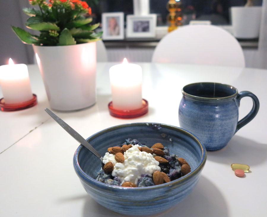 Lite kalcium- och proteinrik keso och knapriga sötmandlar på toppen, samt extra omega-3 och vitaminneraltillskott för att säkerställa behovet trots allt ”power”. Placebo eller inte? Jag håller mig i alla fall frisk. Godmorgon!