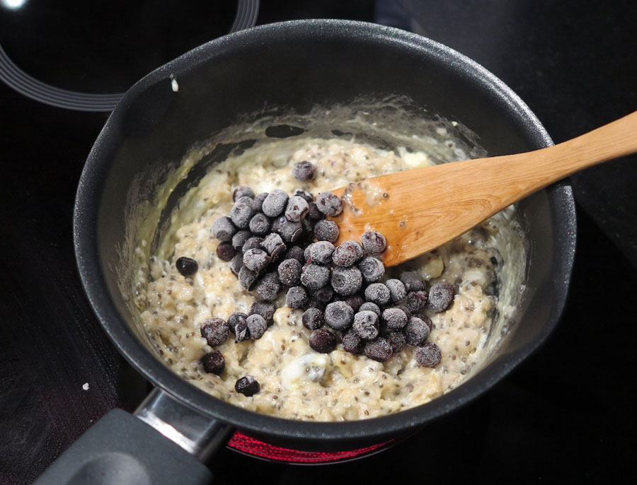 Hemligheten smakmässigt – en nypa vaniljpulver bland grynblandningen, bestående av 1 dl havregryn, 2,5 dl vatten och 1 msk chiafrön. Sistnämnda rika på bl.a. omega-3, kalcium, protein, fibrer och balanserar blodsockret. (Tips – just nu till 30% rabatt på Bodystore).