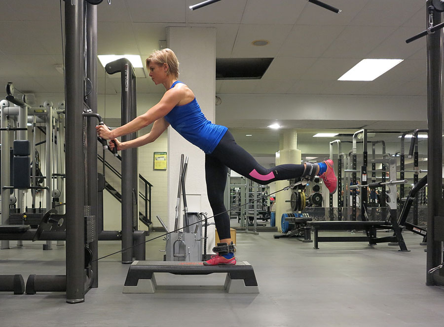 Sista övningen i passet – ett typiskt ”rumplyft”. Annars utfallsgång, marklyft, enbenssquat och lårcurl i TRX, samt overhead squat.