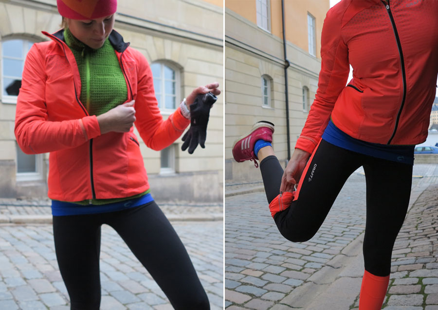 Dagens träningskläder: Mössa och tights närmast huden – Kari Traa, jacka, tights över och vantar – CRAFT, linne närmast huden och strumpor – Gococo, fleece-jacka – Norröna, skor – Adidas.