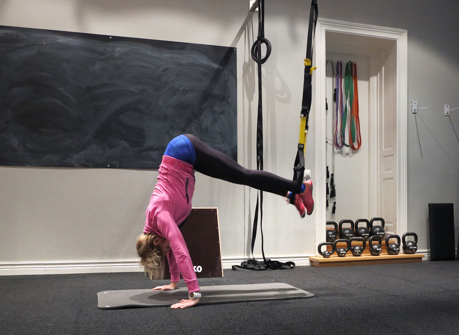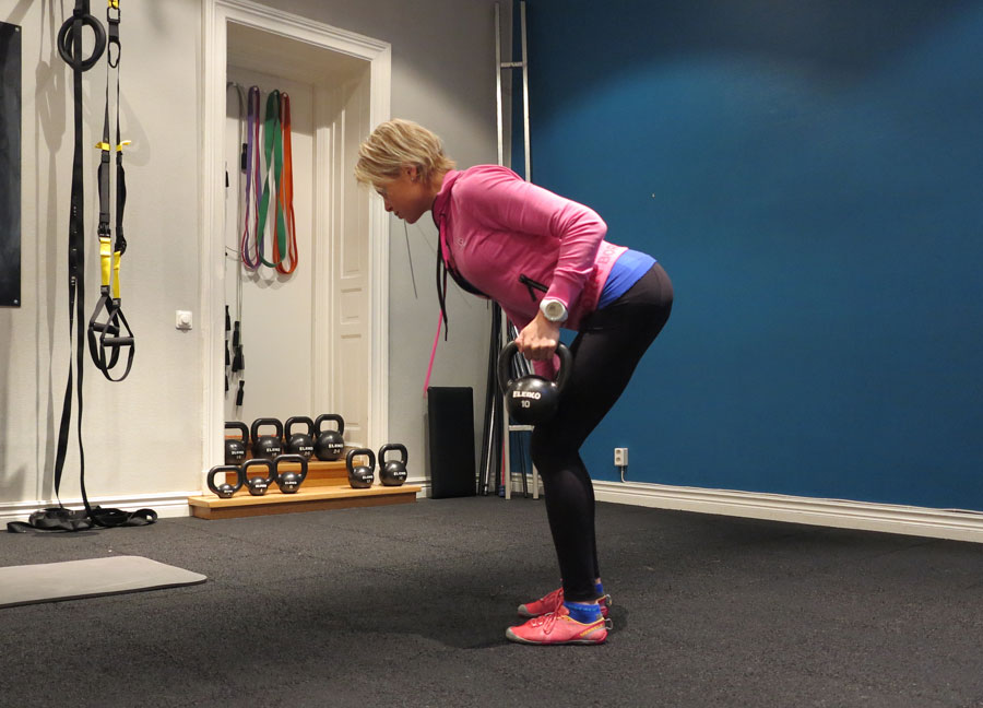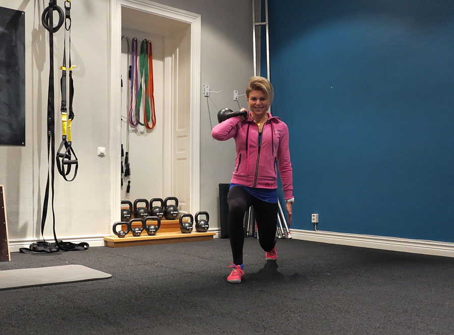Morgonens klient fick bl.a. köra marklyft, utfallsgång med kettlebell i rack (översta bilden) i superset med enarmsrodd, och i slutet av passet flera övningar i TRX (ovan ”peak”) – bra för att lära sig aktivera bålen samtidigt som du jobbar med rumpa/lår/rygg m.m. Förmågan att orka hålla en stark core länge är avgörande för att inte få ont i ryggen under ett så långt lopp som Vasaloppet, och fler övningstips inför skidsäsongen visar jag nästa gång. Missa inte!