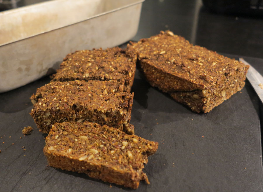 Servera gärna din grönkålssoppa med kokt ägg och gott bröd. Själv bakade jag P-bröd (döpt efter en vän till mina föräldrar) när jag ändå hade ångan uppe – ett slags filmjölksbröd där du kan ta lite av de mjöl- och frösorter du har hemma och bara röra ihop. Hur enkelt som helst, men observera att det ska vara en bra stund i ugnen: