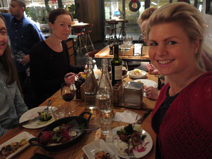Exempel på riktigt misslyckad wefie (en suddig, men bättre på Instagram, @trendotraning). Linda blundar, Anna är oförberedd, Johanna glad men syns inte, och fotografen tar upp halva bilden. Men så kan det bli när bloggaren har fokus på sällskapet istället, och kvällen var långt ifrån misslyckad. Uppdatering om våra liv, jobb, familj och framtidsplaner, skratt och god mat.