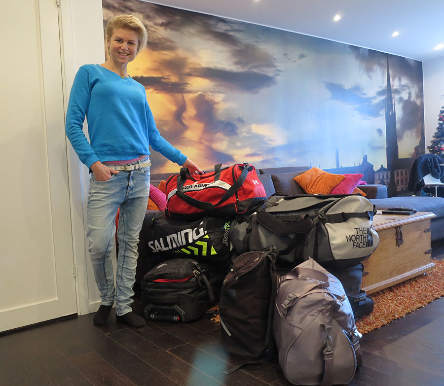 Sköna reskläder med tröja från Ewear och lösa G-Star Raw-jeans. Väskor från nästan alla träningsmärkesföretag som finns.