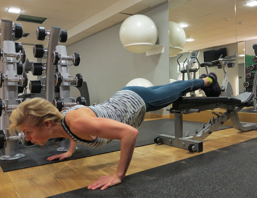 1. Armhävningar är en av de bästa övningarna som finns att köra var som helst, hur som helst. Hitta din nivå på tå men eftersträva en variant där du är i plankpossition med kroppen för att få hjälp av core- och benstyrkan (jo – det hjälper att spänna hela kroppen). Ex. med fötterna upphöjda för en tyngre övning med mer belastning på axlar, på golv, med händerna mot högre föremål eller väggen.