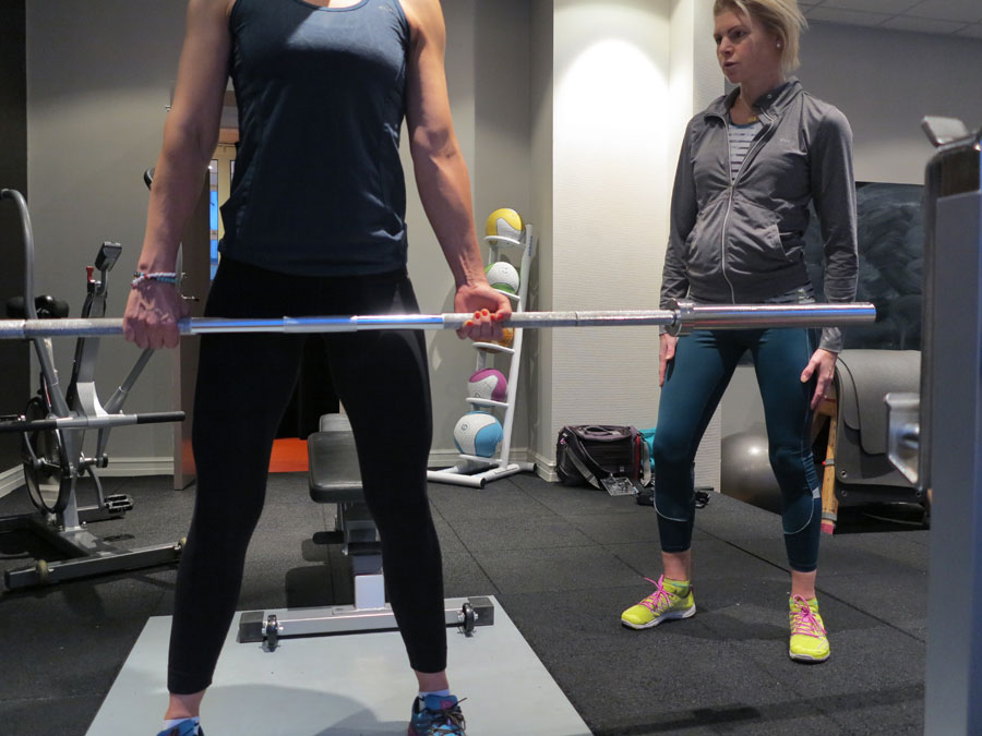 Milla har bl.a. ”mer kontakt med rumpan” som träningsmål, och då är raka marklyft en bra basövning. Extra fokus på att knipa rumpan i övre läget och behålla kontakten både när du fäller i höften och reser dig upp.