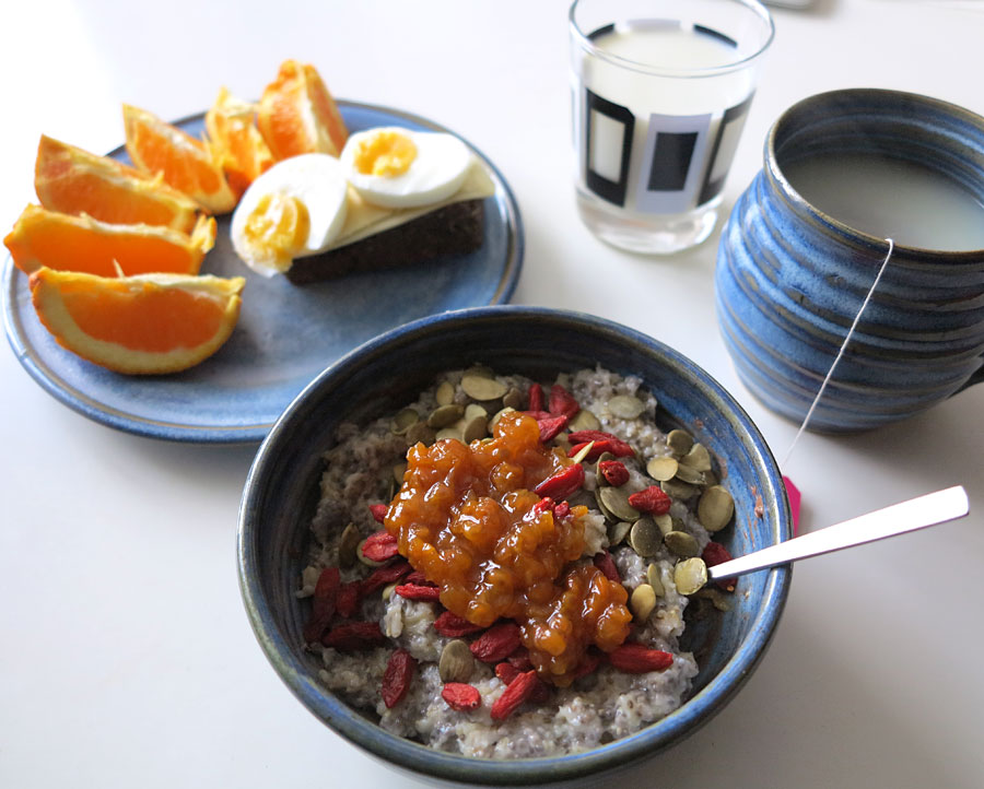grot_hjortrHavregryn + chia-gröt med pumpakärnor, gojibär och mammas hjortronsylt, ost- och ägg-macka, mjölk on the side, apelsin och Pukka Love-te ♥
