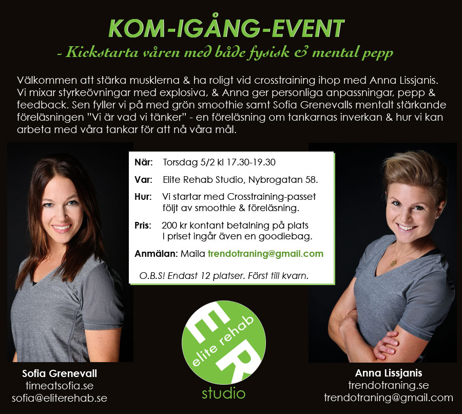 Lägligt i samband med veckans träningstema i vårutmaningarna mot ”Toppenform 2015”, vill jag tipsa om mitt och Sofia Grenevalls Kom-igång-event på Elite Rehab Studio torsdag 5/2. Ännu ett tillfälle för att få inspiration och övningstips vid mitt crosstrainingpass, ett pass där alla kan hänga med och jobba efter egen dagsform. Därefter en kort paus med möjlighet för dusch innan Sofias intressanta föreläsning ”Vi är vad vi tänker”, som handlar om det viktigaste för att vi ens ta oss till träningen – vår inställning och våra tankar.