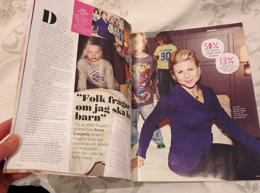 Något som är aktuellt redan idag är en artikeln i senaste numret av mama, där jag är med och berättar om min diastas. Jag vet att mörkertalet med kvinnor som lider av samma skada är stort och att många nekas hjälp, därför berättar jag gärna öppet om mitt problem. Nu, efter snart 4 år, har jag blivit kallad till en sjukgymnast på SÖS som är specialiserad på mammamagar. Alla läkare jag träffat (vilket är många) samt Katarina Wognerud, den mest kunniga jag känner om mammamagar, har sagt att det inte går att träna ihop en så bred diastas som min. Ändå är det en sjukgymnast jag skickas till. Nåväl. Det kan ju vara intressant att se hur de jobbar.