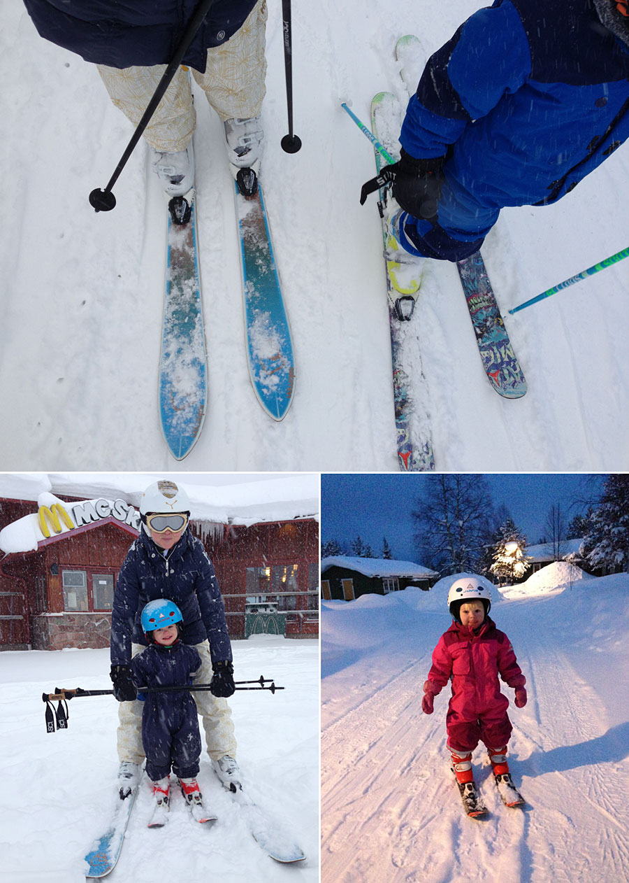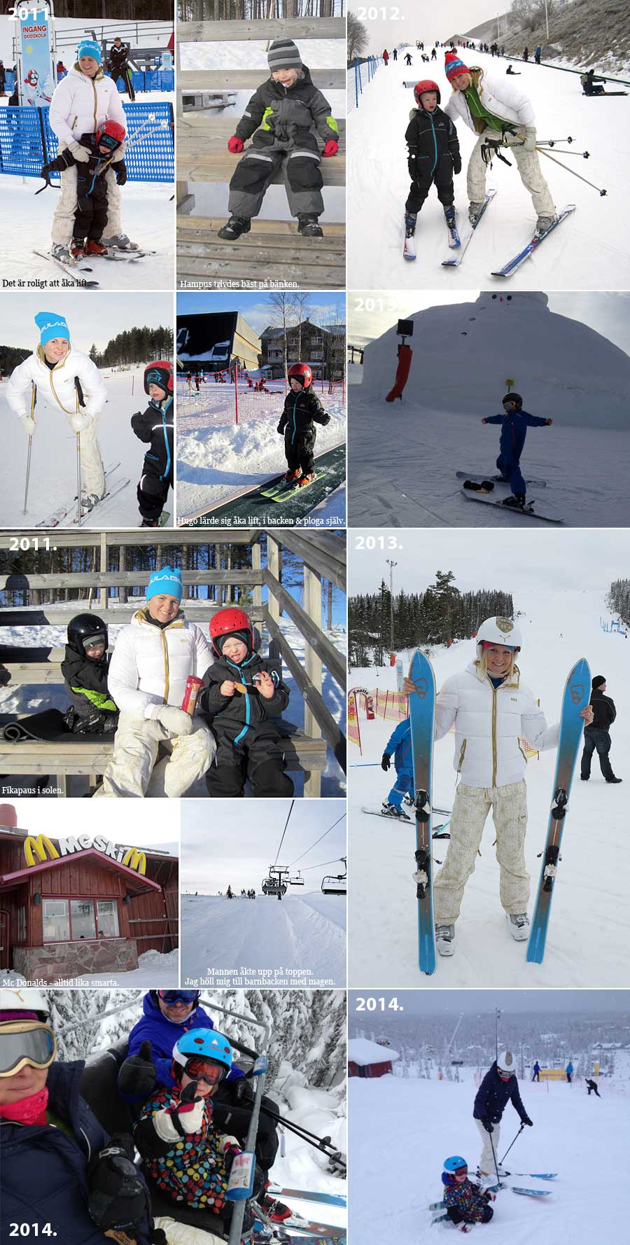 - 2012 (överst till höger) höll vi oss hemma med två bebisar, med det blev ändå lite ”slalom på tippen” (Hammarbybacken som egentligen är ett sopberg) med Hugo. Det året vägrade Hampus.