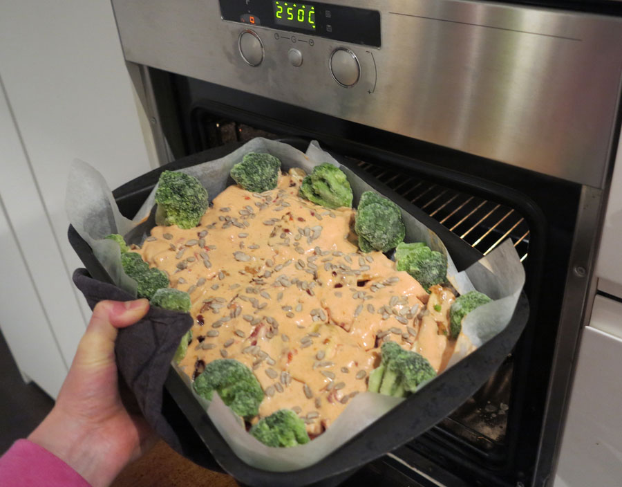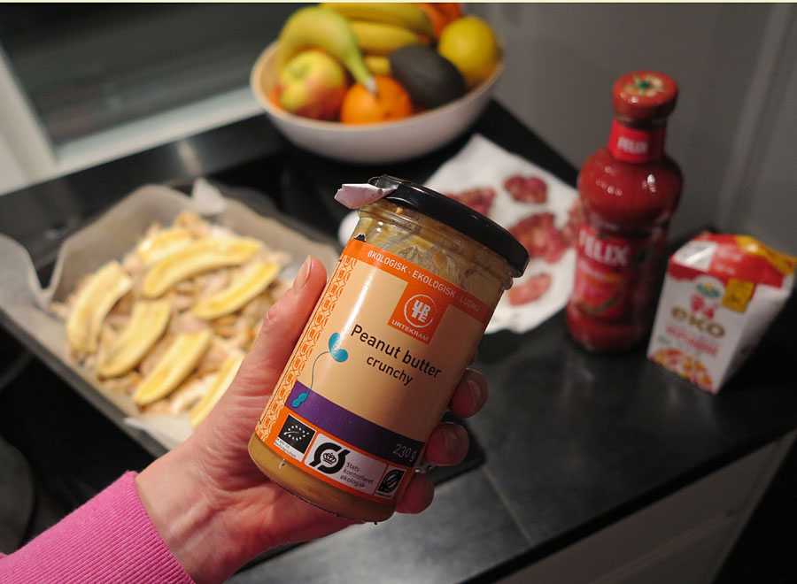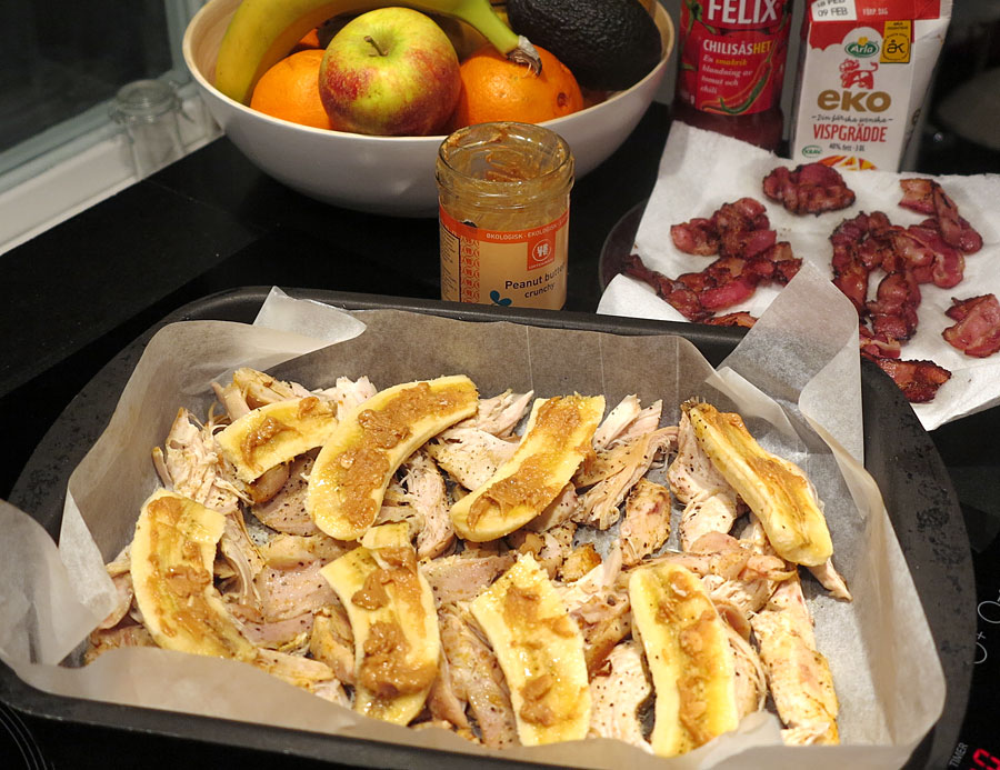 Och i brist på vanliga jordnötter till din Flygande Jakob – bred jordnötsmör med crunch på bananen istället. Låt broccoli tillagas samtidigt i ugnen, och strö solrosfrön över. Annars det klassiska receptet.